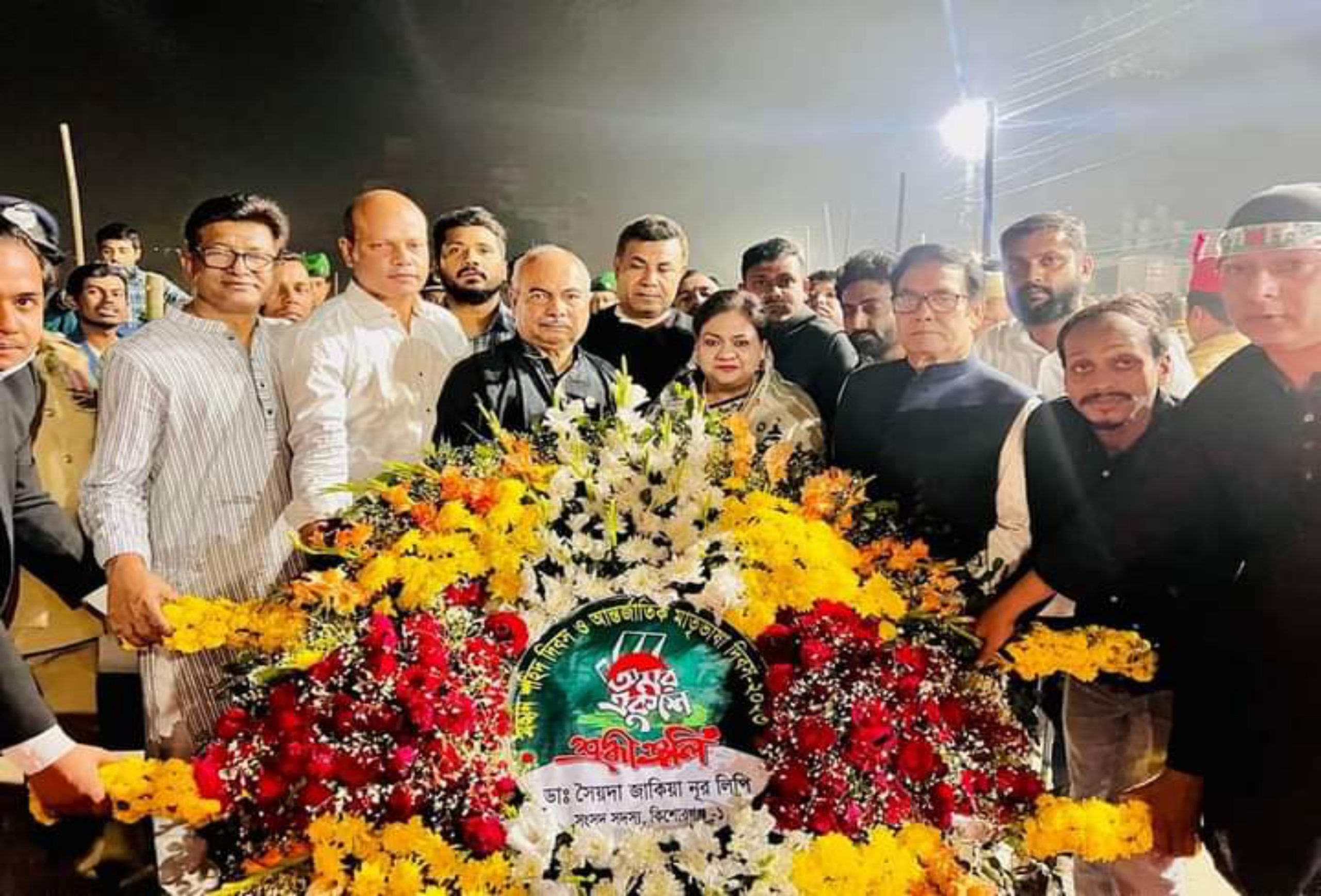 প্রতি বছরের ন্যায় কিশোরগঞ্জবাসী গুরুদয়াল সরকারি কলেজ সংলগ্ন শহরের কেন্দ্রীয় শহীদ মিনারে আজ মঙ্গলবার ১২টা ১ মিনিটে অর্থাৎ প্রথম প্রহরে পুষ্পস্তবক অর্পণ করে।প্রায় শতাধিক প্রতিষ্ঠান পুষ্পস্তবক অর্পণ করে।সকলেই ২১শের চেতনায় মুখরিত ছিলো।পুষ্পস্তবক অর্পণে ডা:সৈয়দা জাকিয়া নূর লিপি কিশোরগঞ্জ-০১, কিশোরগঞ্জ জেলা প্রশাসক, কিশোরগঞ্জ পৌরসভা, মুক্তিযুদ্ধাগণ, কিশোরগঞ্জ জেলা আওয়ামীলীগ, যুবলীগ, ছাত্রলীগ, কৃষকলীগ, জেলা মহিলা আওয়ামী লীগ, জেলা যুব মহিলা আওয়ামী লীগ, কিশোরগঞ্জ জেলা জাতীয়তাবাদি দল(বিএনপি), যুবদল, ছাত্রদল, জেলা শিল্পকলা একাডেমি, জেলা আইনজীবী পরিষদ, জেলা বঙ্গবন্ধু পরিষদ, গুরুদয়াল সরকারি কলেজ, ঈশাঁ খা ইন্টারন্যাশনাল ইউনিভার্সিটি, কিশোরগঞ্জ মডেল কলেজ, ফিরোজা মেডিকেল ইনস্টিটিউট, কিশোরগঞ্জ সদর ব্যবসায়ি মালিক সমিতি, সুগন্ধা ডিপার্টমেন্টাল স্টোর, বাসদ, পরিবার পরিকল্পনা কার্যালয়, কিশোরগঞ্জ চক্ষু হাসপাতাল, জেলা সঞ্চয় অফিস, বাংলাদেশ শিক্ষক সমিতি কিশোরগঞ্জ, মুক্তিযুদ্ধা সন্তান সংসদ, কিশোরগঞ্জস্থ করিমগঞ্জ উপজেলা মানব কল্যাণ ক্লাব(KKC), কিশোরগঞ্জস্থ ইটনা উপজেলা মানব কল্যাণ ক্লাব,ফারিয়া কিশোরগঞ্জ সদরসহ বিভিন্ন রাজনৈতিক, সামাজিক ও সাংস্কৃতিক সংগঠনগুলো অংশগ্রহণ করে।