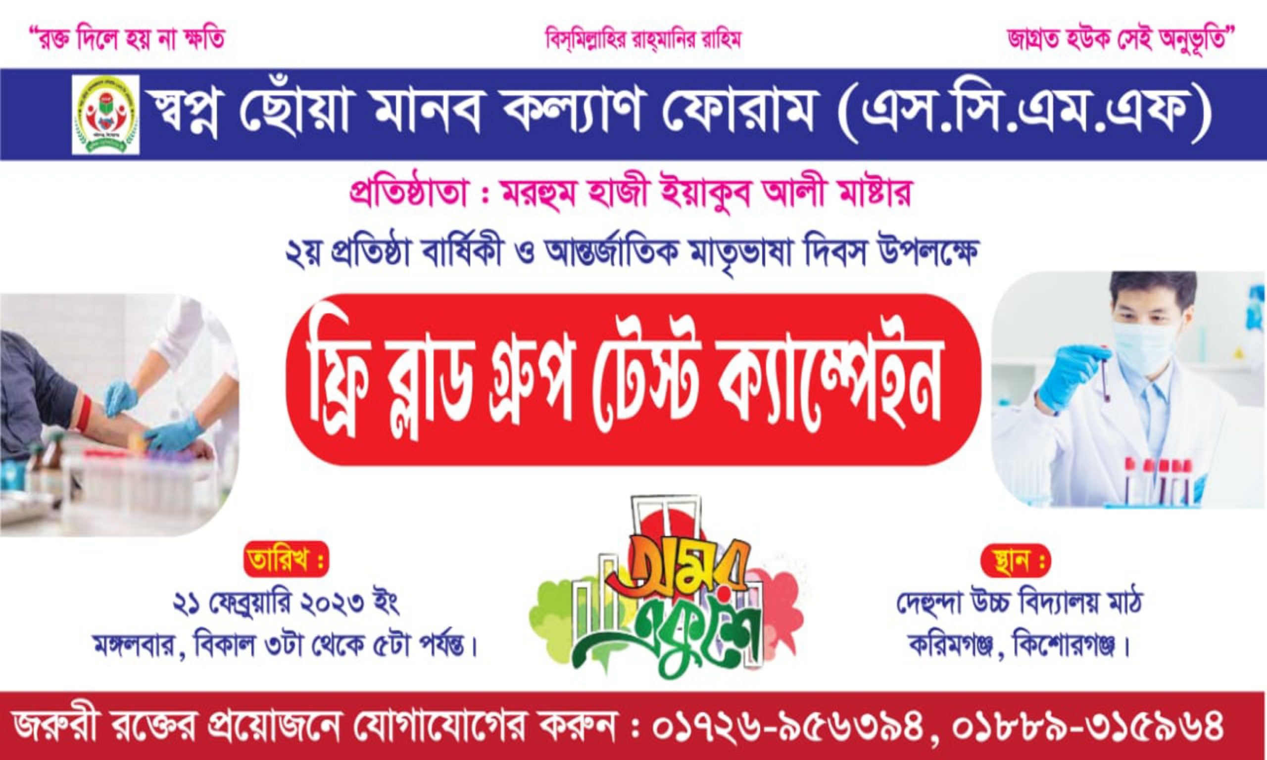 আন্তর্জাতিক মাতৃভাষা দিবস উপলক্ষে স্বপ্নছোয়াঁ মানব কল্যাণ ফোরামের ফ্রি ব্লাড গ্রুপ টেস্ট ক্যাম্পেইন