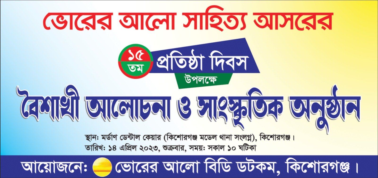 ১৪এপ্রিল,-২০২৩,শুক্রবার ভোরের আলো সাহিত্য আসরের ১৫ তম প্রতিষ্ঠা দিবস উপলক্ষে অনাড়ম্বর পরিবেশে বৈশাখী আলোচনা ও সাংস্কৃতিক অনুষ্ঠান পালন করা হয়।