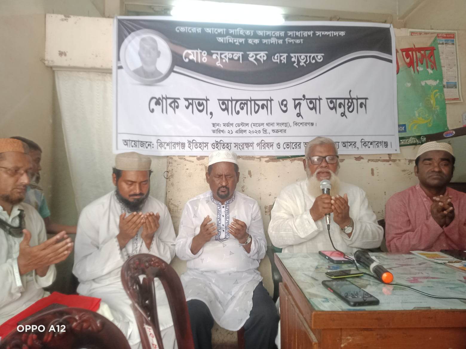 স্টাফ রিপোর্টার ঃ ভোরের আলো সাহিত্য আসরের সাধারণ সম্পাদক আমিনুল হক সাদীর পিতা মোঃ নূরুল হকের মৃত্যুতে শোক সভা আলোচনা ও দুয়া মাহফিল সম্পন্ন হয়েছে। শুক্রবার সকালে জেলা শহরের মডেল থানা সংলগ্ন মডার্ণ ডেন্টালে কিশোরগঞ্জ ইতিহাস ওইতিহ্য সংরক্ষণ পরিষদ ও ভোরের আলো সাহিত্য আসরের আয়োজনে অনুষ্ঠিত আলোচনাসভায় সভাপতিত্ব করেন সংগঠনের সভাপতি নাট্যকার আজিজুর রহমান। প্রধান অতিথি ছিলেন বিআরডিবির সাবেক পরিচালক বীরমুক্তিযোদ্ধা এড নিজাম উদ্দিন। প্রধান আলোচক ছিলেন বিআরডিবির