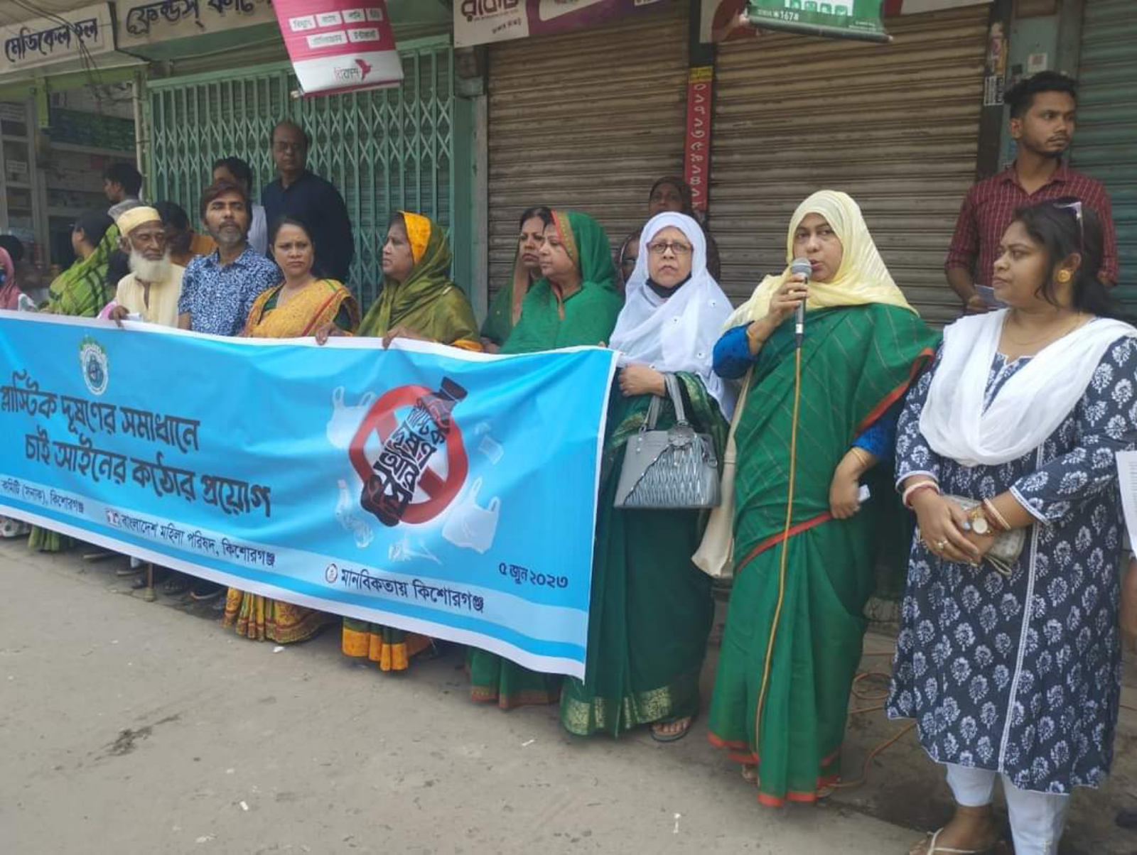 মানববন্ধনে সকল ধরণের প্লাস্টিক ও পলিথিন ব্যবহার নিষিদ্ধে আইনগত পদক্ষেপ গ্রহণ, প্লাস্টিক দূষণ রোধে জনসাধারণের মধ্যে সচেতনতার উদ্যোগ গ্রহণ, প্লাস্টিক প্রযুক্তির পরিবর্তে জৈব প্রযুক্তির ব্যবহার বিশেষত পাটজাত পণ্যের উৎপাদনে উৎসাহিত করা এবং বাজারজাতকরণে সংশ্লিষ্ট কর্তৃপক্ষের উদ্যোগ গ্রহণ, বিজ্ঞান সম্মত বর্জ্যে ব্যবস্থাপনার জন্য পৌর কর্তৃপক্ষের উদ্যোগ গ্রহণ, নরসুন্দা নদী দখলমুক্ত, দূষণ রোধ ও নদীর পূর্ব অবস্থা ফিরিয়ে আনার জন্য সিএস মূলে নদীর সীমানা পিলার স্থাপন, পুকুর ভরাট ও দখলরোধে প্রশাসনের আইন অনুযায়ী পদক্ষেপ গ্রহণ, পৌর কর্তৃপক্ষকে স্থাপনা নির্মাণ অনুমোদনে ইমারত নির্মাণ বিধি অনুসরণ, হাওড় এলাকায় চলমান উন্নয়নের কারণে পানি প্রবাহ বাধাগ্রস্থ হওয়াসহ জীববৈচিত্র্য নষ্ট হওয়ার আশংকা রয়েছে এমন প্রকল্প বাস্তবায়ন হতে বিরত থাকা, পরিবেশ ও জলবায়ু পরিবর্তন রোধে যে কোন প্রকল্প বাস্তবায়নে স্বচ্ছতা ও জবাবদিহিতা নিশ্চিতে তথ্যের উন্মুক্ততা ও নাগরিক অংশগ্রহণ নিশ্চিত করা, বৃক্ষ নিধন রোধ এবং সরকারি ও বেসরকারি পর্যায়ে বনায়নের উদ্যোগ গ্রহণের দাবি উত্থাপন করা হয়। মানবনন্ধনে বক্তব্য প্রদান করেন সনাক সদস্য প্রফেসর আবদুল গনি, সনাক সদস্য ফিরোজ উদ্দিন ভূইয়া, মহিলা পরিষদ জেলা শাখার সাধারণ সম্পাদক আতিয়া রহমান, সহ সাধারণ সম্পাদক বিলকিস বেগম, সদস্য মাহফুজ আরা পলক, জাতীয় মহিলা সংস্থার সদস্য শাহীন সুলতানা, মানবিকতায় কিশোরগঞ্জ এর সদস্য মোনালিসা, এনজিও সমন্বয় পরিষদের সদস্য তারিকুল ইসলাম প্রমুখ।
