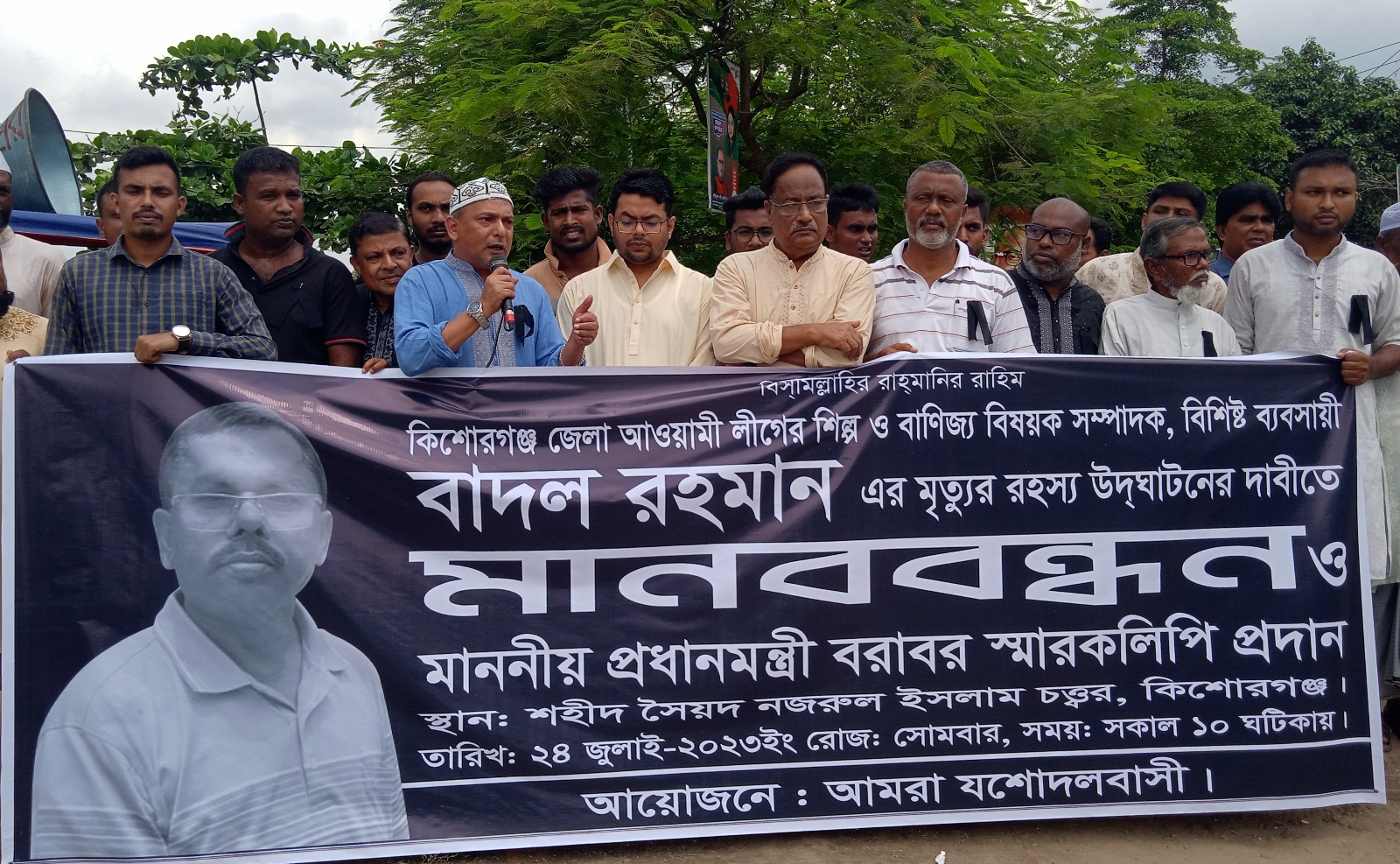কিশোরগঞ্জ জেলা আওয়ামী লীগের শিল্প ও বাণিজ্য বিষয়ক সম্পাদক বাদল রহমান এর মৃত্যুর রহস্য উদঘাটনের দাবীতে মানববন্ধন ও মাননীয় প্রধানমন্ত্রী বরাবর স্মারকলিপি প্রদান করা হয়েছে।