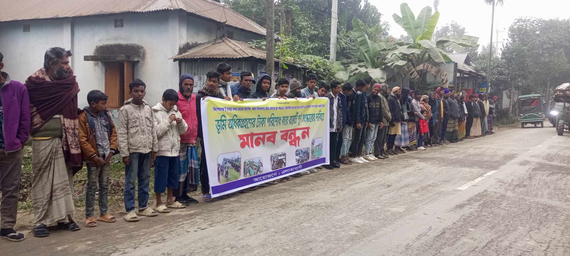 ভূমি অধিগ্রহণের টাকা পরিশোধ ও দ্রুত রাস্তা সংস্কারের দাবিতে করিমগঞ্জে মানববন্ধন