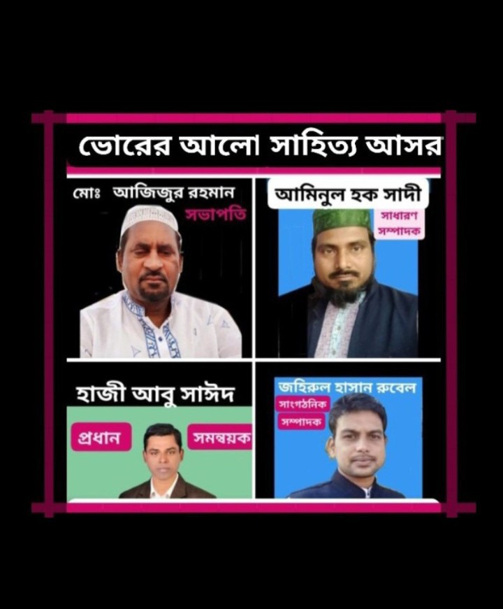 কবিতা পাঠ,গান পরিবেশন,বক্তৃতা প্রদান, সার্টিফিকেট বিতরণ ও ভোরের আলো সাহিত্য আসরের পুনর্গঠনের মাধ্যমে গঠিত হয়েছে ভোরের আলো সাহিত্য আসরের ৮৫৩ তম সভা।