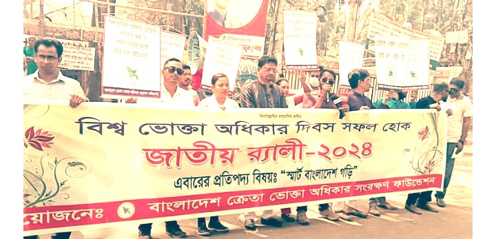বিশ্ব ভোক্তা অধিকার দিবস ২০২৪ পালন করা হয়েছে। ২০০১ সাল থেকে জাতীয় র্যালী সহ বিভিন্ন কর্মসূচির মধ্যে দিয়ে দিবসটি পালন করে আসছে বাংলাদেশ ক্রেতা ভোক্তা অধিকার সংরক্ষণ ফাউন্ডেশন।তারই ধারাবাহিকতায় বিভিন্ন কর্মসূচির মাঝদিয়ে আজ দিবস উদযাপন করে সংগঠন টি। সংগঠনের চেয়ারম্যান লায়ন নুর ইসলামের নেতৃত্বে সকাল ৯ ঘটিকায় মতিঝিল শাপলা চত্বর থেকে বর্ণাঢ্য র্যালির মধ্য দিয়ে দিবসটি শুরু হয় ।জাতীয় র্যালিটি শহরের বিভিন্ন স্থান প্রদক্ষিণ করে জাতীয় প্রেসক্লাবের সামনে এসে আলোচনার মধ্যে দিয়ে প্রথম পর্ব শেষ হয়।