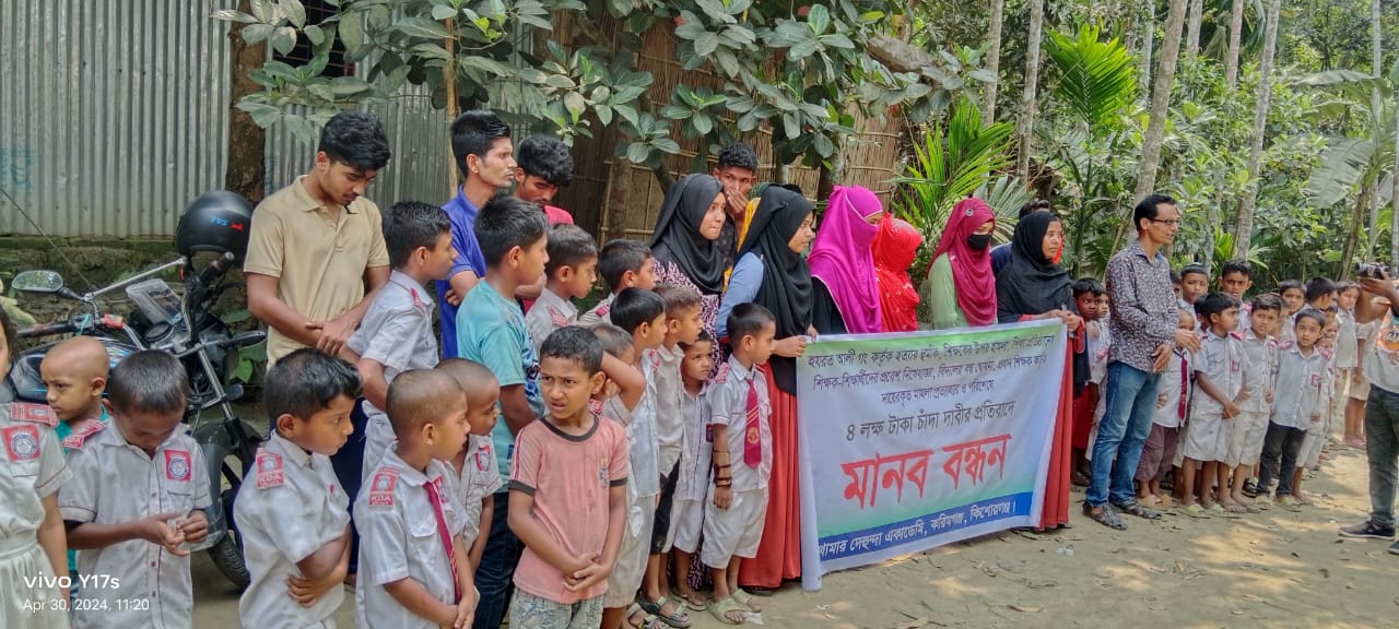 (নিজস্ব প্রতিবেদন)কিশোরগঞ্জ জেলার করিমগঞ্জ উপজেলার খামার দেহুন্দা একাডেমির প্রধান শিক্ষককে হযরত আলী গ্যাং হত্যার হুমকি,শিক্ষকদের উপর হামলা,বিদ্যালয় বন্ধ ঘোষণা, প্রধান শিক্ষক কর্তৃক দায়েরকৃত মামলা প্রত্যাহার ও চার লাখ টাকা চাঁদা দাবির প্রতিবাদে মানববন্ধন করেছে প্রতিষ্ঠানের শিক্ষক, শিক্ষার্থী ও অভিভাবকরা।মঙ্গলবার(৩০ এপ্রিল) সকাল ১০টায় খামার দেহুন্দা একাডেমি চত্বরে এ মানববন্ধন হয়।