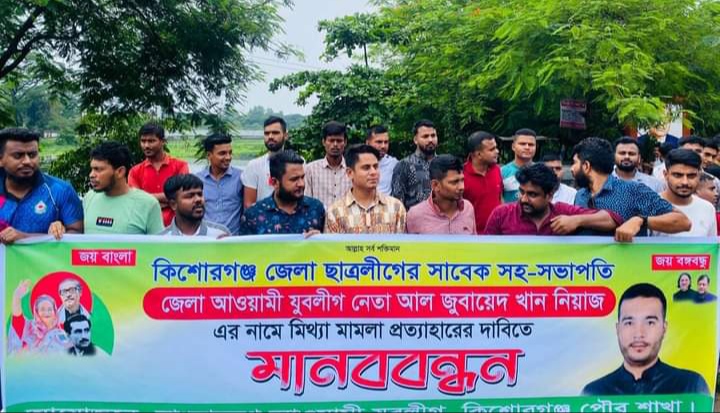 বৃহস্পতিবার(২০জুন) দুপুরের দিকে শহীদ সৈয়দ নজরুল ইসলাম চত্বরে কিশোরগঞ্জ পৌর যুবলীগের ব্যানারে এ মানববন্ধন পালিত হয়।