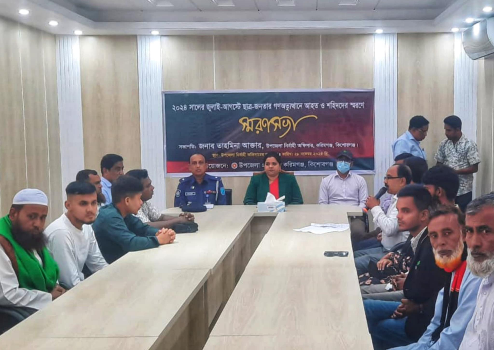 (মো:সারোয়ার জাহান)কিশোরগঞ্জের করিমগঞ্জে ২০২৪ সালের জুলাই-আগস্টে ছাত্র-জনতার গণঅভ্যুত্থানে আহত ও শহিদদের স্মরণে উপজেলা প্রশাসনের উদ্যোগে স্মরণসভা অনুষ্ঠিত হয়েছে।