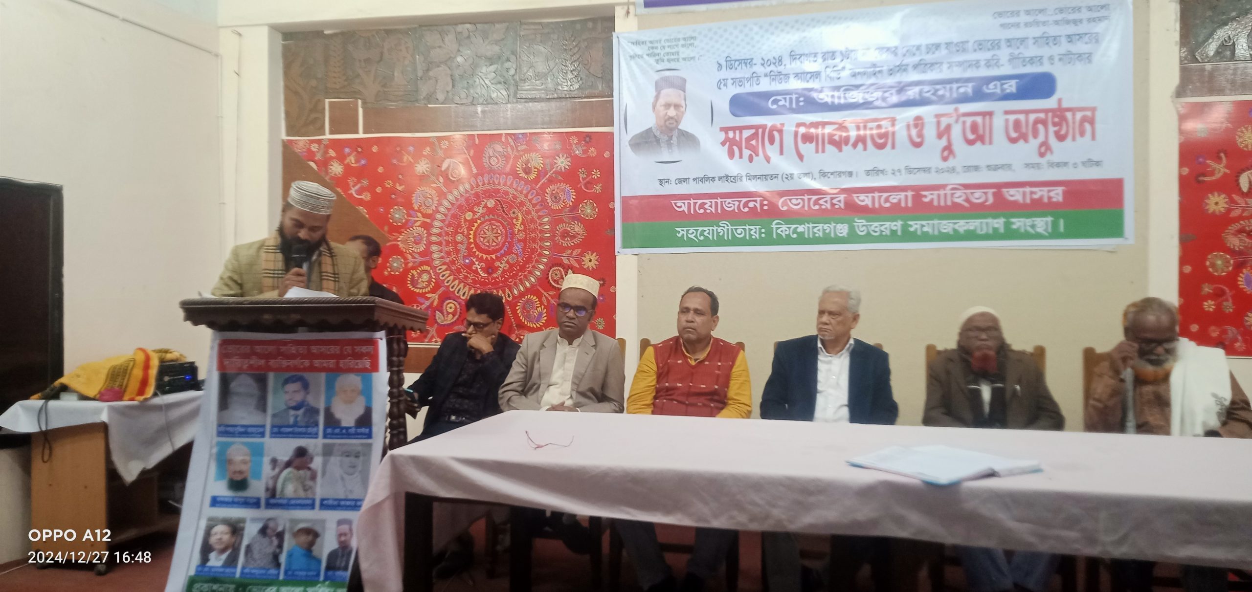 আজ ২৭ ডিসেম্বর (শুক্রবার) বিকেল ৩টা হতে সন্ধ্যার পর ৭টা পর্যন্ত ৪ঘন্টা ব্যাপী কিশোরগঞ্জ জেলা পাবলিক লাইব্রেরি মিলনায়তনে ভোরের আলোর সভাপতি আজিজুর রহমান ওপর শোক আলোচনা ও দু'আ কর্মসূচী পালন করা হয়।