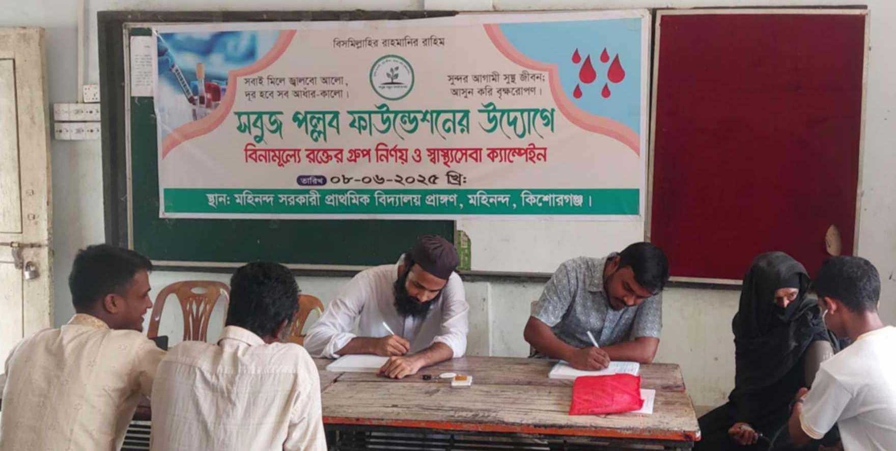 সবুজ পল্লব ফাউন্ডেশন ( কিশোরগঞ্জ সদর উপজেলা শাখা) এর উদ্যোগে গতকাল ০৮জুন ২০২৫ খ্রি: তারিখে বিনামূল্যে স্বাস্থ্য সেবা ও রক্তের গ্রুপ নির্ণয় কার্যক্রম পরিচালিত হয়। উক্ত ক্যাম্পেইন এ মোট ২৫০ জনেরও বেশি মানুষকে বিনামূল্যে স্বাস্থ্য সেবা প্রদান করা হয়। স্বাস্থ্য সেবা প্রদান করেন ডাক্তার ডা.আমিনুল ইসলাম এম.বি.বি.এস